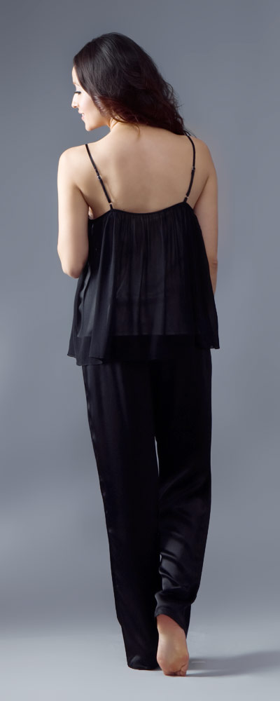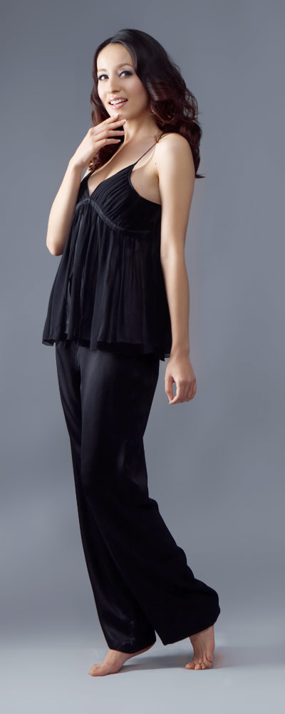 Wie gut auch Pyjamas eine weibliche Ausstrahlung unterstreichen können, zeigt dieses schöne Modell. Zu einer langen Hose wird ein raffiniert geschnittenes Top mit Spaghettiträgern kombiniert. Das Top, das bis zu den Hüften reicht, besticht durch sein elegantes und außergewöhnliches Design. Der Seidenchiffon, aus dem das schöne Oberteil gefertigt ist, ist in  mehreren Lagen gelegt und attraktiv gerafft. Das Bustier ist durch eine verzierende Naht abgesetzt und muschelförmig gearbeitet. Die Raffungen finden sich auch hier wieder. Die bequeme Hose, die durch ein elastisches Bündchen in der Taille gehalten wird, besteht dagegen aus einem glatten Seidenkrepp, der ihr ein schönes Schimmern verleiht. Die Träger des angenehm weit geschnittenen Tops können von den Damen individuell in der Länge verstellt werden. Im klassischen Schwarz wirkt dieser Damen Schlafanzug äußerst elegant – noch dazu eignet sich die figurumspielende Passform ideal, um kleine Problemzonen zu kaschieren. Egal, welche der sechs Konfektionsgrößen von XS bis XXL Damen auch tragen, in diesem Pyjama machen sie immer eine gute Figur.