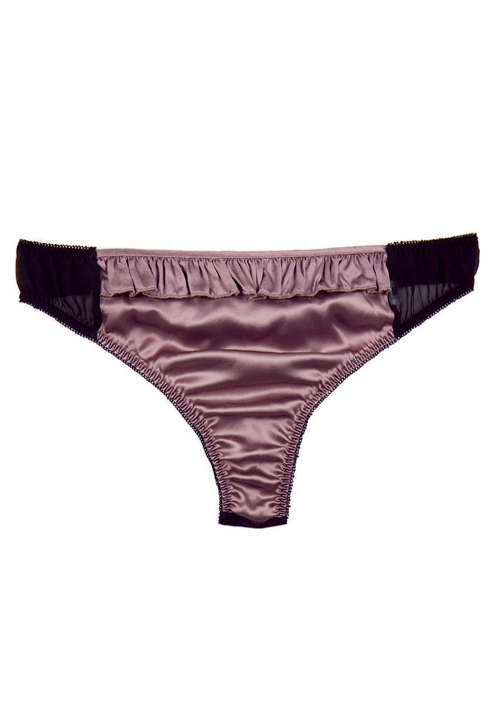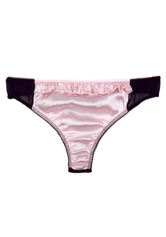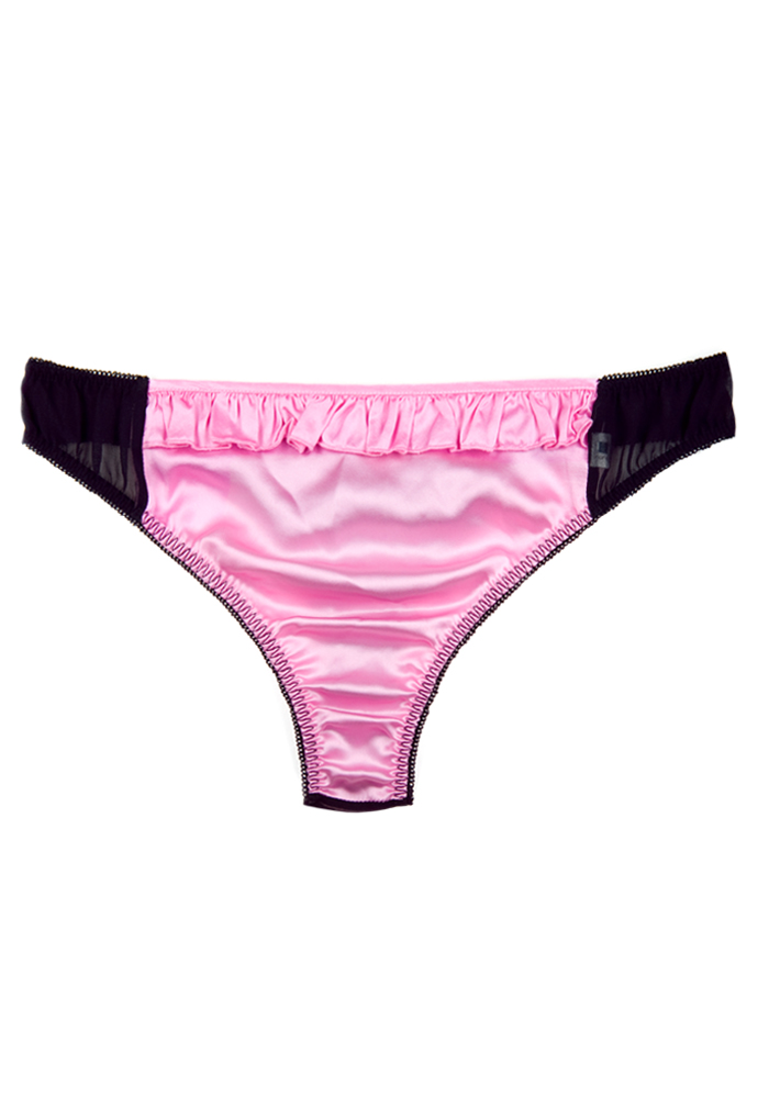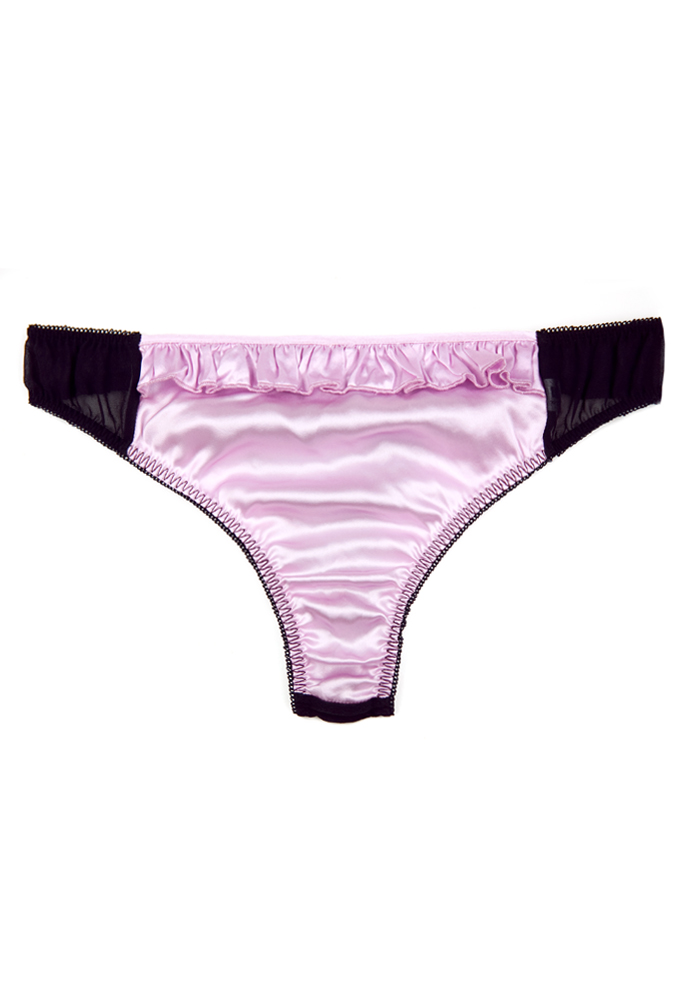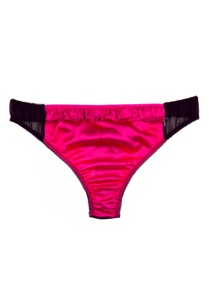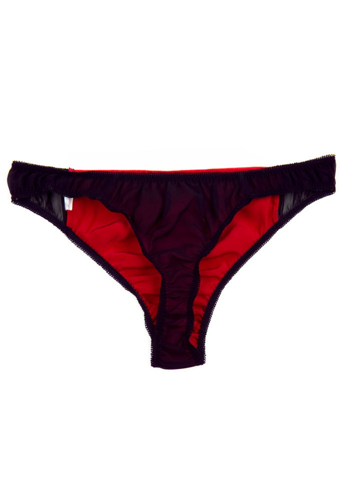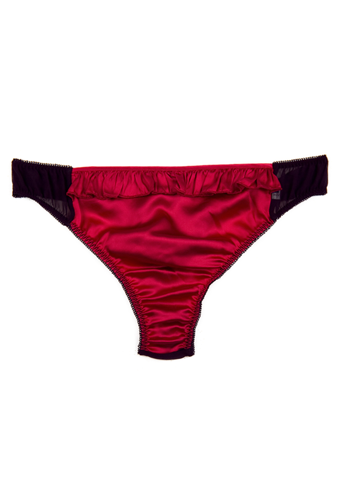 Schwarz und Rot gehören zu den beliebtesten Farben für Unterwäsche und Dessous. Dieser Tanga-Slip aus reiner Frühlingsseide wird da die Augen vieler Damen zum Leuchten bringen, denn er vereint gleich beide Farben. Und nicht nur das, er besteht auch aus zwei hochwertigen verschiedenen Seiden-Geweben: Leuchtend Rot wie die Liebe und wie die Verführung selbst ist das Vorderteil aus glänzendem Seidenkrepp. Aus schwarzer Georgette bestehen dagegen die Seitenteile. Dieses Gewebe ist hauchzart, leicht transparent und im Gegensatz zum Seidenkrepp mit einer raueren Oberfläche gearbeitet. Ganz raffiniert wird es dann auf der Rückseite, wo das Georgette-Gewebe über den roten Seidenkrepp gelegt ist, der attraktiv hindurchschimmert. Am Taillenband befindet sich zudem ein weiterer Hingucker: Eine große Rüschenborte zieht hier die Blicke auf sich. Für den Damen Tanga wurden natürlich nur hochwertigste Materialien der Exportgüteklasse A verwendet. Die raffinierten Tanga-Slips gibt es noch in vielen weiteren Farben und in Konfektionsgrößen von XS bis XXL.