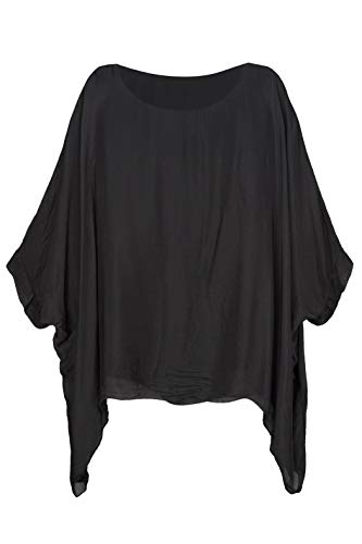 Ebenso elegant wie leger zeigt sich die Seiden-Tunika von Cara Mia. Locker fallende Seide umschmeichelt die Figur und reicht an den länger geschnittenen Seiten bis zu den Knien hinab. Vorder- und Hinterteil enden auf der Höhe der Oberschenkel. Die halblangen Fledermausärmel verleihen der einfarbig schwarzen Tunika ihre besondere Ausstrahlung. Die locker fallende Schnittform steht sowohl sehr schlanken als auch kurvigen Damen. Die oberste Lage zeichnet sich durch feine Tranzsparenz aus. Eine zweite Seidenlage macht die Tunika blickdicht. Das einfarbige, dezente Design erlaubt eine riesige Vielfalt an Kombinationsmöglichkeiten. Ganz leger lässt sich die Seiden-Tunika zur Leggins tragen. Modisch und lässig wirkt sie zur Röhren-Jeans. Am Abend kommt sie als elegantes Kleidungsstück zur Slim-fit Hose in Metallic-Tönen wie Silber oder Kupfer zur Geltung. Damit die Tunika aus 100% Seide lange Zeit schön bleibt, sollte sie ausschließlich schonend von Hand gereinigt werden.