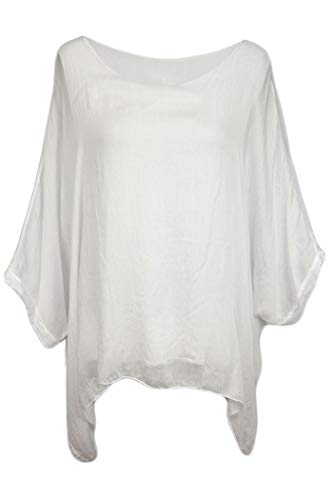 Ganz zart und leicht kommt die Seiden-Tunika von Cara Mia daher. Die weiße Farbgebung strahlt Unschuld und Leichtigkeit aus. Der besondere Clou des ebenso lässigen wie eleganten Designs sind die Fledermausärmel in 3/4-Länge und zarter Transparenz. Auch die oberste Lage des Seidenstoffs ist transparent gearbeitet, darunter schimmert eine blickdichte Lage weißer Seide hervor. Zwei bis zu den Knien reichende Zipfel an den Seiten verleihen der Damen-Tunika ihren legeren Look. Vor allem im Sommer erweist sich die Bluse aus 100% Seide als ideales Kleidungsstück und hält den Körper an kühlen Tagen angenehm kühl. Für ein klassisch-elegantes Outfit kombinieren Damen sie zur schwarzen Hose im Slim-fit Schnitt oder zur Leggings. Im Sommer kommt das weiße Oberteil zu farbigen und bunt gemusterten Hosen besonders schön zur Geltung. Für den optimalen Qualitätserhalt empfehlen wir die schonende Reinigung per Hand.