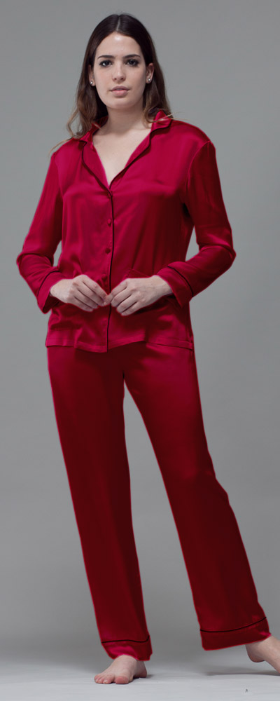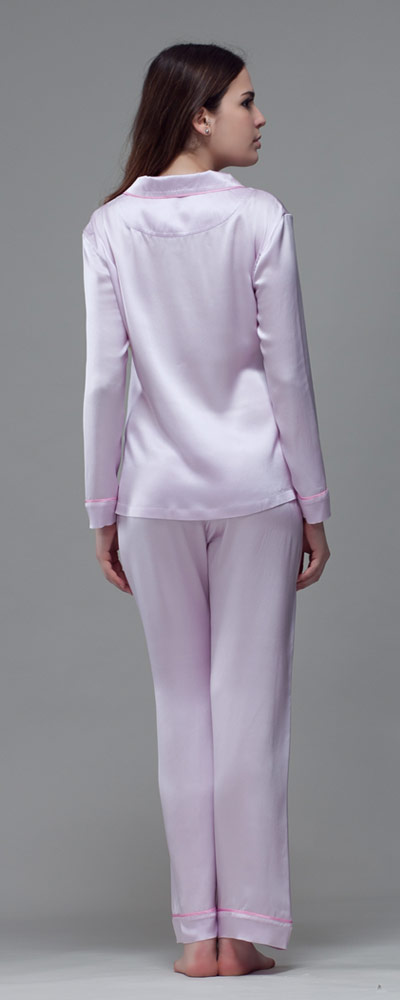 Pyjamas für Damen sind langweilig? Weit gefehlt! Aus reiner Seide gefertigt, können die Schlafanzüge elegant und attraktiv sein und bieten nicht nur einen ausgezeichneten Tragekomfort, sondern auch noch etwas fürs Auge. Zwar verhüllen Pyjamas mehr als knappe Nachthemden oder aufregende Dessous – damit sind sie allerdings auch sehr alltagstauglich und perfekt gerade für die kühlere Jahreszeit. Dieser zart violette Pyjama wirkt darüber hinaus auch sehr feminin, was nicht nur an dem sanften Farbton liegt, sondern vor allem an der figurbetonten Schnittform und dem tiefen V-Ausschnitt. Die Jacke ist in klassischer Hemdform geschnitten und umspielt den Körper bequem, aber dennoch körpernah. Der kleine Hemdkragen, der den V-Ausschnitt umgibt, ist ein hübsches Detail. Die Hose ist gerade geschnitten und köchellang. Zur Dekoration des Seiden Pyjamas ist an den Ärmeln sowie an den Beinen und an der Knopfleiste ein kontrastfarbenes Satinband angebracht. Auch der Kragen ist von dieser Einfassung umgeben. Der Satin setzt elegante Akzente auf dem ohnehin schon sehr edlen Seidenkrepp, der verführerisch noch in vielen weiteren Farben glänzt.