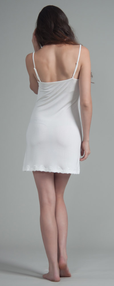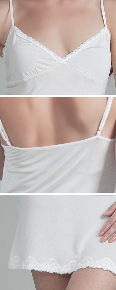 Negligees & Baby Dolls sind ohnehin schon sehr verführerische Dessous, welche die Weiblichkeit einer Frau gekonnt in Szene setzen. Noch schöner allerdings werden sie durch geschickte Verzierungen wie den kleinen Spitzenbesatz, der dieses eng anliegende Negligé zu etwas ganz Besonderem macht. Die Spitze ist Ton in Ton mit dem Nachtkleid gehalten, das sowohl in Elfenbein wie auch im klassischen Schwarz oder einem knalligen Rot bestellt werden kann. Die zarte Borte mit einem Blütenmuster rahmt den V-Ausschnitt des Dekolletees ein, welches durch das bikiniförmige Bustier schön betont wird. Auch am unteren Saum findet sich die Spitzenbordüre wieder, diesmal etwas größer und über den weichen Seidenstoff gelegt. In kleinen, abgerundeten Dreiecken zieht sich die Borte über den gesamten Umfang des Rockes. Die figurbetonte Form unterstreicht die weibliche Figur. Praktisch sind die Spaghettiträger, deren Länge individuell verändert werden kann. Für den optimalen Tragekomfort sorgt das Material, ein feiner Seidenkrepp aus reiner Frühlingsseide der Exportgüteklasse A.