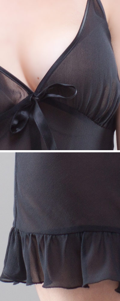 Negligees & Baby Dolls gehören zu den lässigen, gleichsam verführerischen Kleidungsstücken einer Frau. Die knappen Kleidchen betonen weibliche Reize perfekt und zeigen dabei dennoch nicht zu viel. So auch dieses Seiden-Negligé in elegantem Schwarz. Gefertigt ist das kurze Kleid aus hauchzarter und transparenter Georgette, die mit Crepe de Satin Seide verziert ist. Die leichte Transparenz macht dieses Negligé zu einem besonders attraktivem Kleidungsstück, das sowohl aus sexy Unterkleid wie auch als kleines Nachthemd und natürlich auch einfach als verführerisches Dessous getragen werden kann – mit oder ohne dazu passender Unterwäsche. Der Brustteil ist muschelförmig geschnitten, über die Schultern laufen schmale Spaghettiträger, die auf die bevorzugte Länge eingestellt werden können. Unter dem Dekolletee wird das sexy Kleidchen mit einer Schleife gebunden, darunter fällt der Rock etwas weiter, aber dennoch körperbetont herab. Am Saum sitzt eine hübsche Rüschenborte. Gewagt, und doch elegant – so wird dieses Negligé aus reiner Frühlingsseide seine Trägerin verzaubern.