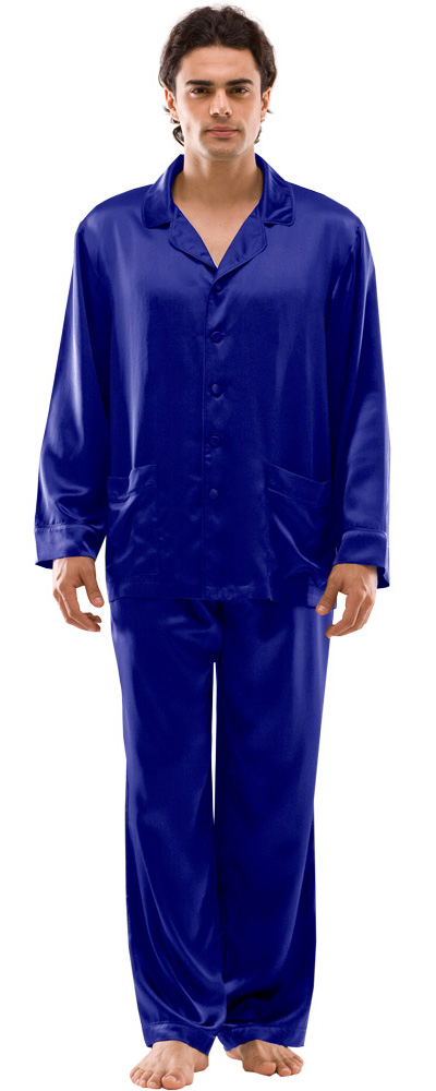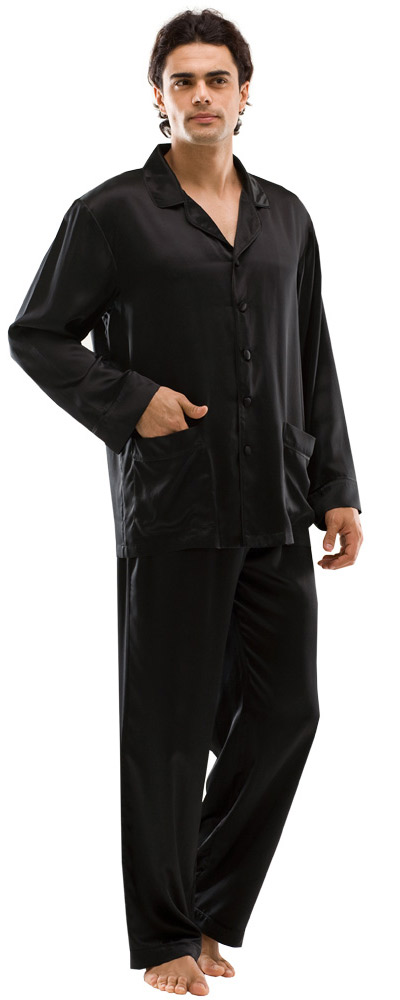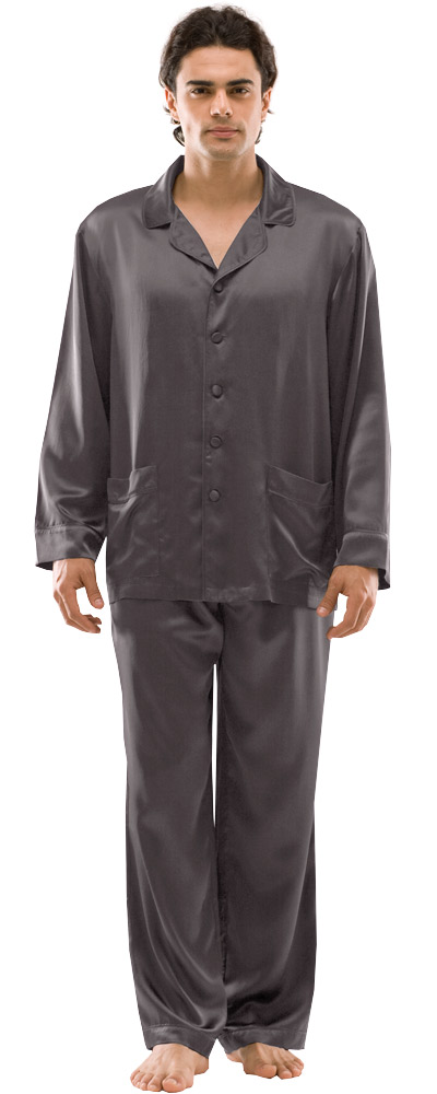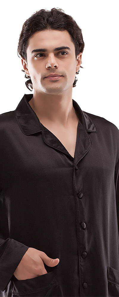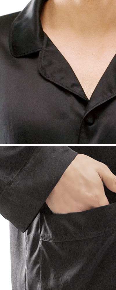 Im klassischen Hemdschnitt ist die Jacke dieses schönen Herren Pyjamas gehalten. Sie besitzt einen kleinen Kent-Kragen und eine Knopfleiste. Passend zur sanft schimmernden Frühlingsseide der Jacke sind auch die Knöpfe mit reinem Seidenkrepp überzogen. Weich und angenehm gerade geschnitten fällt die Jacke und sitzt locker am Körper. Diese Passform können wirklich alle Herren tragen, unabhängig von ihrer Konfektionsgröße. Ob XS oder XXL, der schöne Seiden Pyjama kann in sechs verschiedenen Größen bestellt werden, ein guter Sitz ist aufgrund der hochwertigen Verarbeitung und der idealen Formgebung garantiert. Die Jacke wird durch zwei seitlich angesetzte Taschen auf der Vorderseite abgerundet. Genauso schlicht wie elegant ist auch die Hose des Herren Schlafanzugs geschnitten. Ein elastisches Bündchen hält sie an ihrem Platz. Genau wie bei der Jacke ist der Schnitt gerade, der Seidenstoff fällt leicht und trägt sich im Sommer wie im Winter ausgesprochen angenehm. Dieser Schlafanzug aus reiner Seide ist daher ein ideales Basic. Erhältlich ist er in fünf verschiedenen Farben, vom klassischen Schwarz bis hin zum mondänen Dunkelrot.
