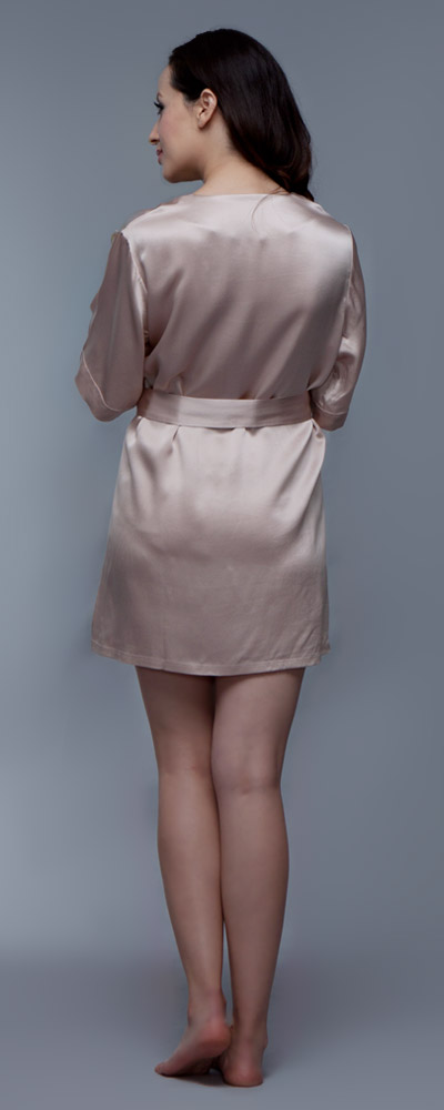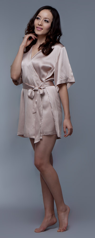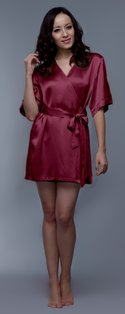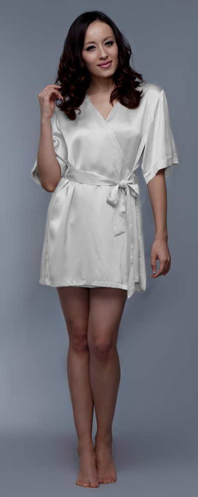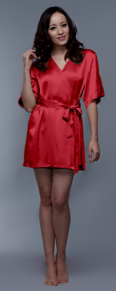 Schöne Beine muss man auch mal herzeigen – schon morgens gelingt das mit diesem kurzen Seiden-Kimono, der weit über dem Knie endet. Auch die Ärmel des Morgenrocks sind kurz gehalten. Damit zeigen Damen viel Haut, wirken aber nach dem Duschen oder Baden immer noch angezogen. Morgenmäntel & Kimonos sind die legere Art, sich nach dem Aufstehen in eleganten Stoff zu hüllen. Bestehen sie aus Seide, würde man sie am liebsten gar nicht mehr ausziehen, um den ganzen Tag den weichen Stoff auf der Haut zu spüren. Dieser Seidenkimono besteht aus hochwertiger Frühlingsseide der Exportgüteklasse A und einem Seidengewicht von 19momme. Feminin und lässig umschmeichelt er die Kurven aller Frauen, ganz egal, ob Konfektionsgröße XS oder XXL. Zusammengehalten wird der Seiden-Bademantel von einem Hüftband, das natürlich ebenfalls aus Seidenkrepp besteht. Damen, die nie mehr auf den angenehmen Tragekomfort verzichten möchten, können gleich mehrere Exemplare in verschiedenen schönen Farben bestellen.