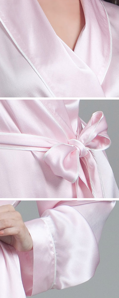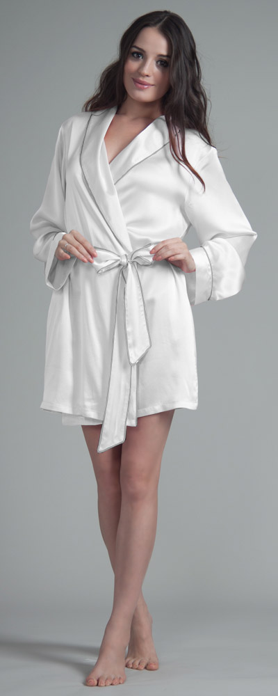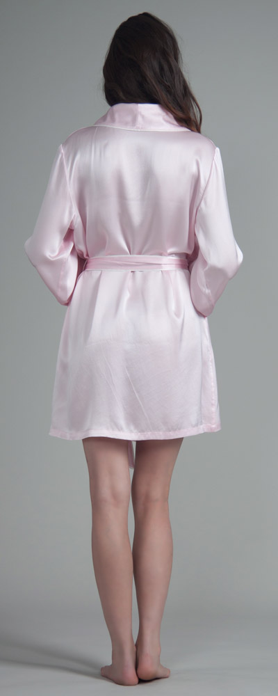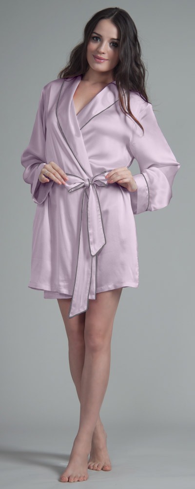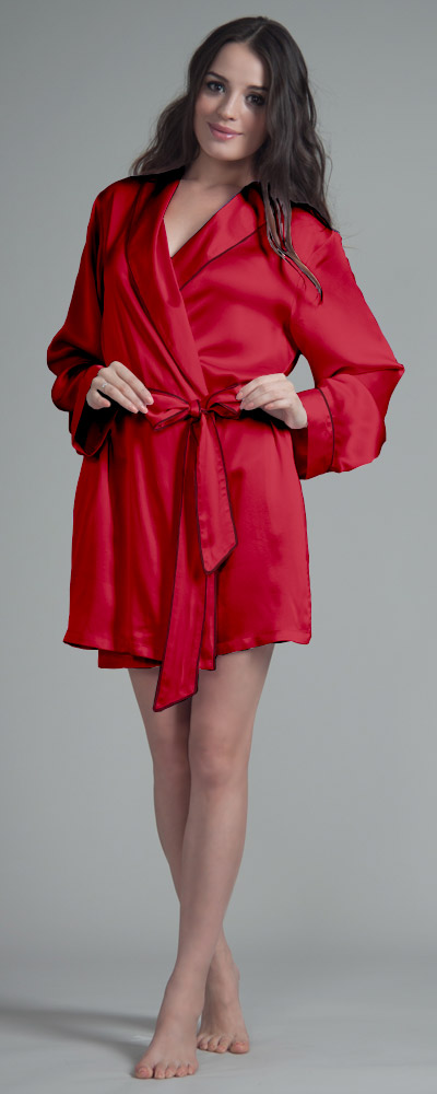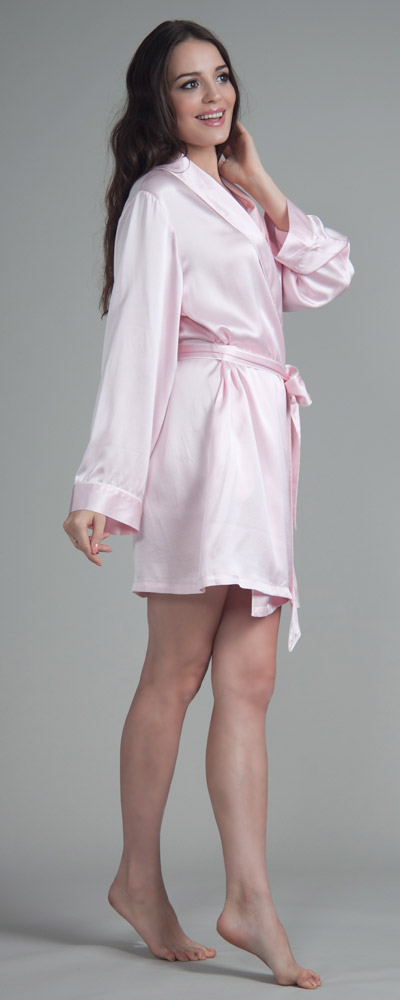 Morgenmäntel & Kimonos sollten sich im Kleiderschrank jeder Frau finden lassen. So ein Morgenrock ist nämlich nicht nur ein äußerst praktisches Kleidungsstück, das nach dem Aufstehen oder nach dem Duschen warm hält; es kann auch äußerst sexy aussehen. So wie zum Beispiel dieser hübsche Bademantel, der sehr kurz geschnitten ist und am oberen Oberschenkel endet. Das zeigt viel Bein, was die attraktive Wirkung des changierenden Seidenkrepps unterstreicht. Ganz sanft und weich umspielt die reine Naturseide die weiblichen Formen; dabei ist es egal, ob die Trägerin sehr schlank oder etwas fülliger ist, denn den hübschen Morgenrock gibt es in sechs verschiedenen Konfektionsgrößen. Groß ist auch die Auswahl an unterschiedliche Farben. Mädchenhaft und unschuldig wirkt der Morgenmantel aus Seide etwa in einem zarten Hellpink, fast verrucht und selbstbewusst dagegen in Dunkelrot oder Schwarz. Der Kragen wird leicht umgeschlagen und ist genau wie der restliche Bademantel und das Hüftband mit einer schönen Ziernaht besetzt.