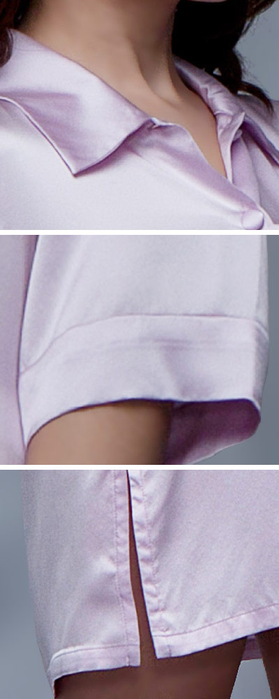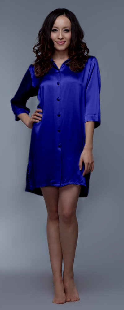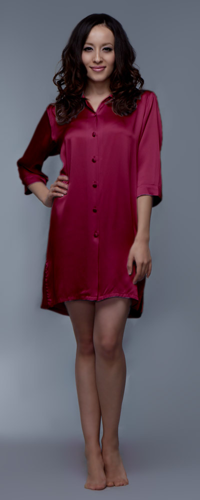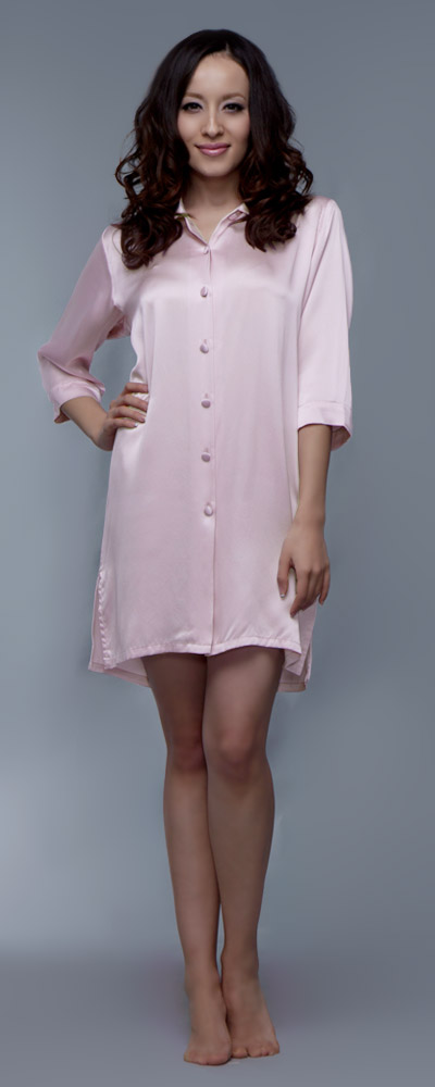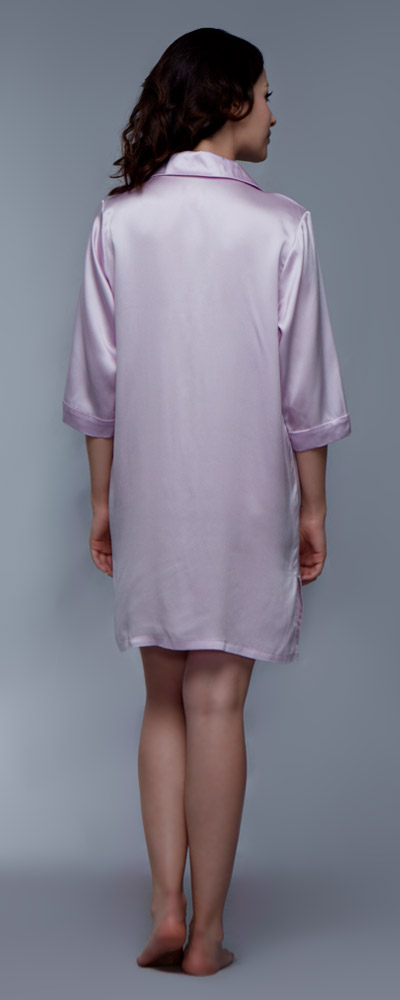 Frauen, die bequeme Nachtemden lieben, werden dieses hübsche Modell zu schätzen wissen. Weich und weich fällt es um den Körper, engt daher nicht ein und ist gemütlich genug für einen guten und erholsamen Schlaf. Sanft umspielt es die Oberschenkel, frech ist der kurze Schnitt. An den Seiten befinden sich darüber hinaus zwei attraktive Schlitze, die noch mehr Bein zeigen. Denn gemütlich muss nicht gleich unattraktiv sein, das beweist dieses Damen Nachthemd in Perfektion. Das Design ist im Stil einer klassischen Hemdbluse gehalten, wirkt dadurch burschikos, aber auch jugendlich und frisch. Der Hemdkragen endet in einem kleinen V-Ausschnitt, der in eine hübsche Knopfleiste übergeht. Die Knöpfe sind mit Seidenstoff überzogen und Ton in Ton mit dem Nachthemd aus reiner Frühlingsseide gehalten. Das Hellviolett dieses Nachthemds wirkt besonders feminin und freundlich; erhältlich ist das schöne Modell aber auch noch in weiteren gefälligen Farben. So ist für jeden Geschmack eine Variante dabei. Das Nachthemd mit dem halblangen Arm hat die Qualität, um schnell das Lieblingsstück für eine geruhsame Nacht zu werden.