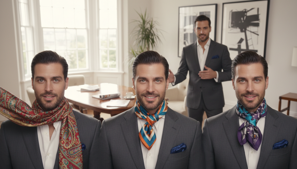 - Der Business-Look: Kombiniere einen dunklen Anzug mit einem Seidenschal in einem dezenten Muster. Trage den Schal als Pariser Knoten oder einmal um den Hals geschlungen.