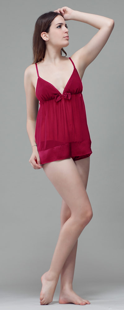 Leicht transparente Georgette-Seide ist ein für Dessous gerne gewähltes Material. Besonders aufregend sind auch Negligees und Baby Dolls, die aus dem zarten Gewebe gefertigt werden. Dieses außergewöhnlich verführerische Modell ist zudem noch in den beiden Farben erhältlich, die für das Höchstmaß an Attraktivität stehen: in einem klassischen Schwarz und einem leuchtenden Rot. Tief ist der Ausschnitt des knappen Nachtgewandes, der von einer schönen Satinborte eingerahmt wird. Als verspieltes Detail ist eine kleine Schleife zwischen den Brüsten aufgenäht. Viel Haut zeigt auch der Rückenausschnitt; raffiniert ist die Keyhole-Optik, die durch den kleinen Knopf zustande kommt. Der Saum des Baby Dolls wird ebenfalls von einer breiten Satinborte umrandet. Gehalten wird das knappe Kleid von zwei Spaghettiträgern, deren Länge sich jederzeit einstellen lässt. Der unvergleichlich zarte Stoff umspielt die Figur weich und locker; damit steht das Baby Doll aus reiner Frühlingsseide auch kurvenreichen Frauen ausgesprochen gut. In sechs Konfektionsgrößen ist für jede Frau das richtige Modell dabei.